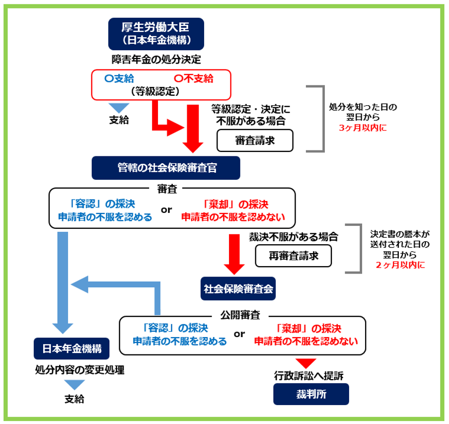 不支給の決定に納得がいかない場合は、不服申し立て(審査請求)を行い、不支給の決定を取り消し、再度、障害年金の受給を目指すことになります。