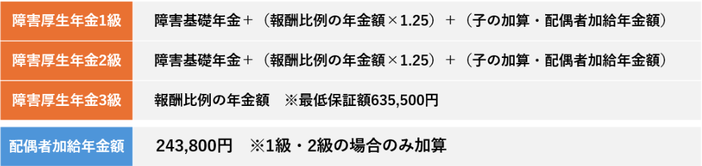 ※配偶者加給年金額:障害厚生年金の1級または2級を受給する方に、生計を維持されている65歳未満の配偶者がいる場合に加算されます。