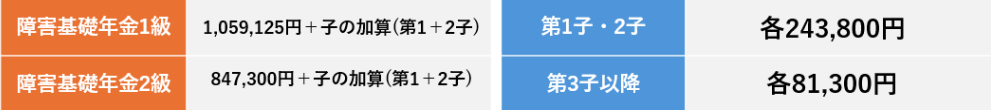 障害基礎年金1級の受給額は月額88,260円、障害基礎年金2級の受給額は月額70,608 円となります。